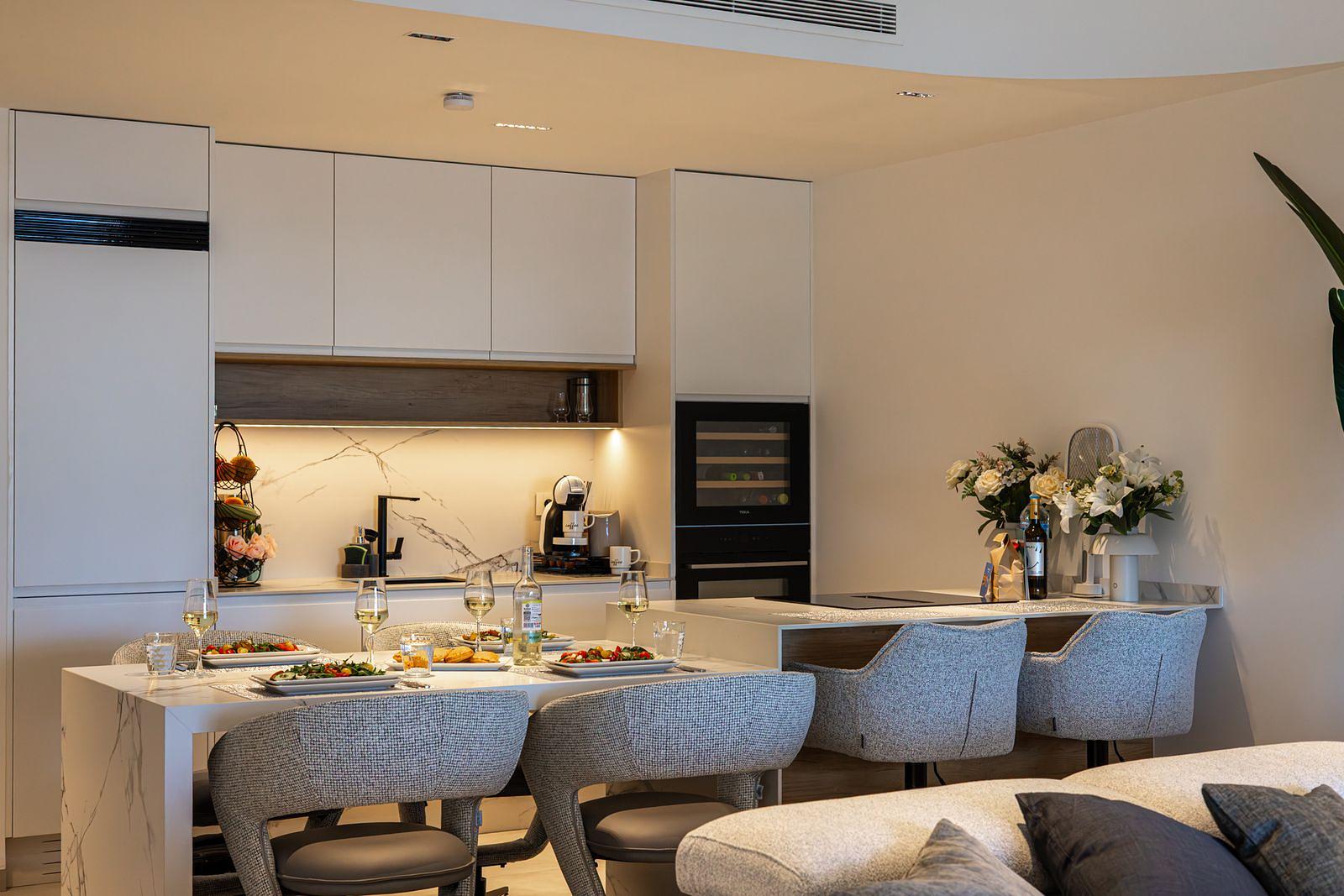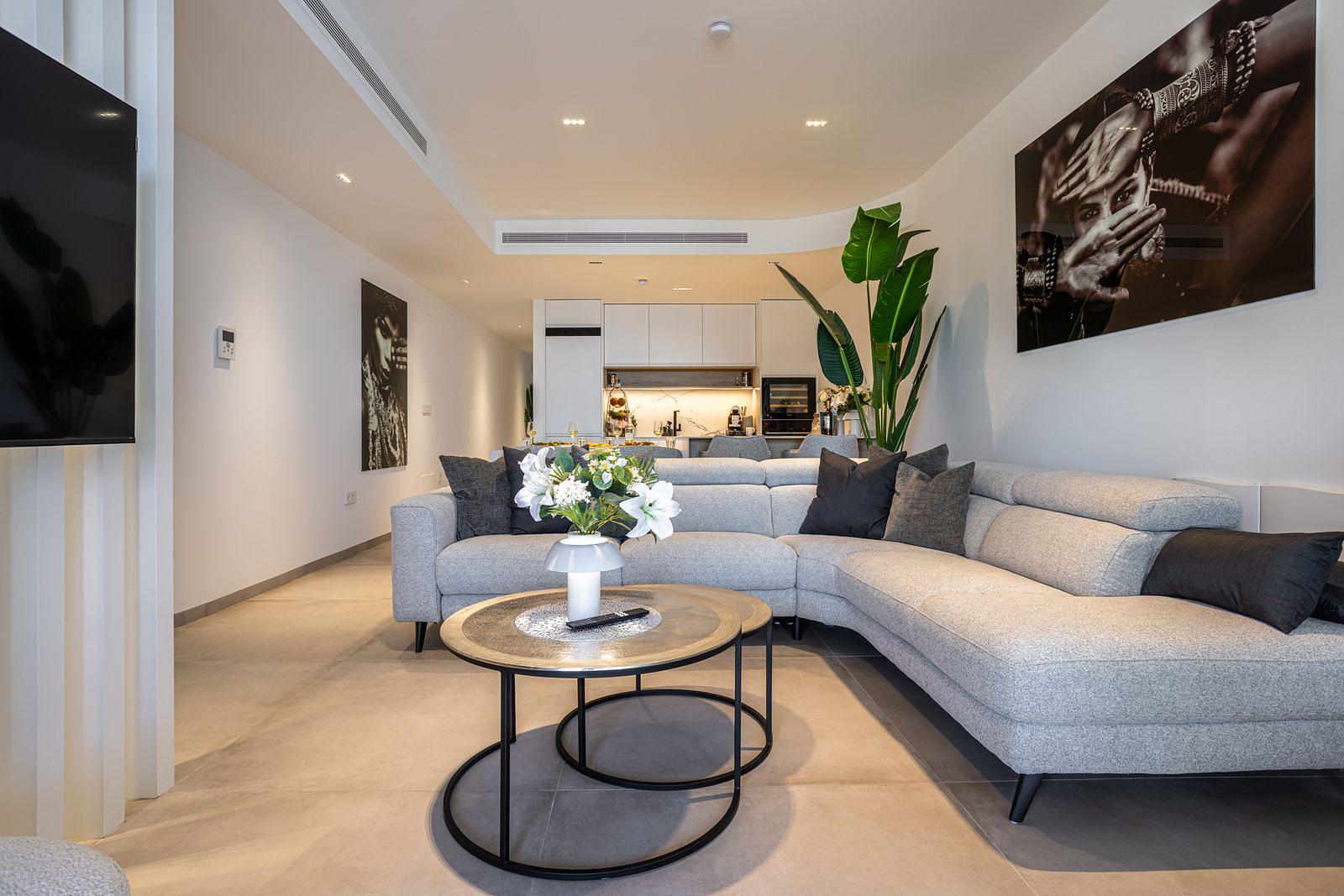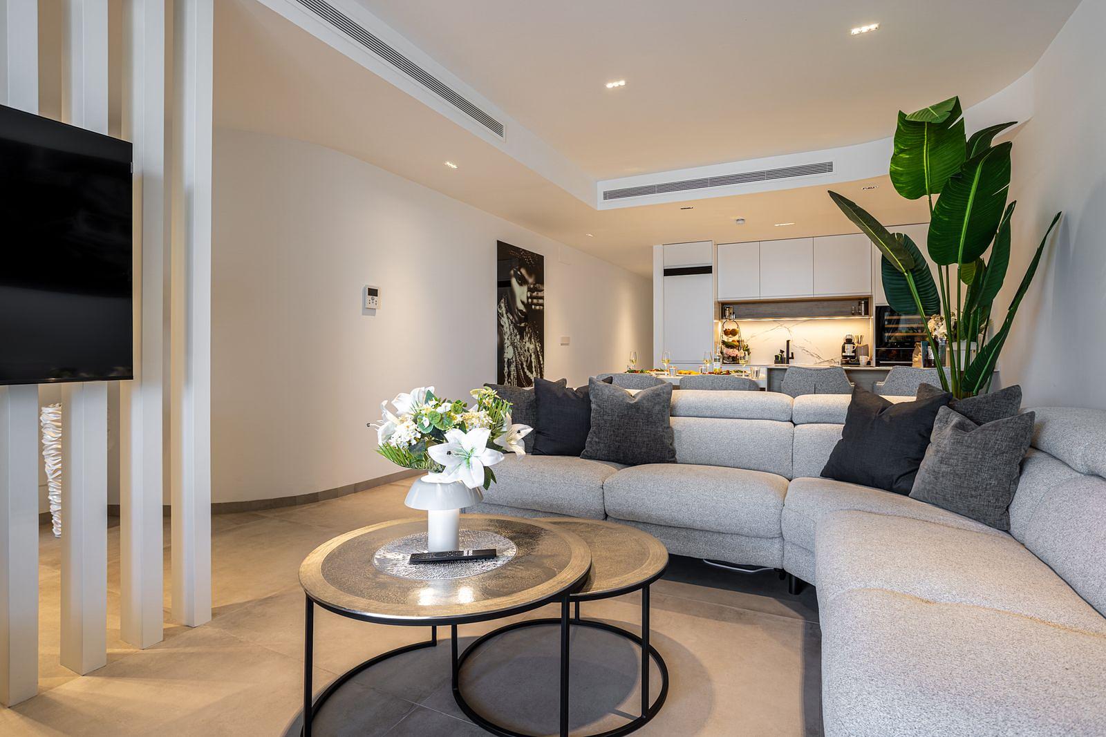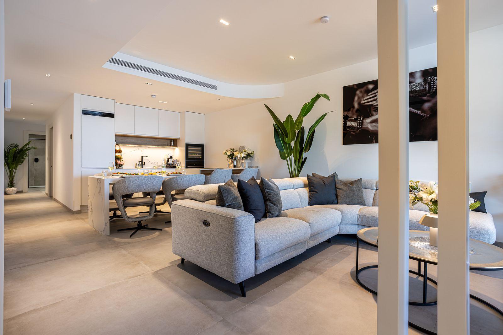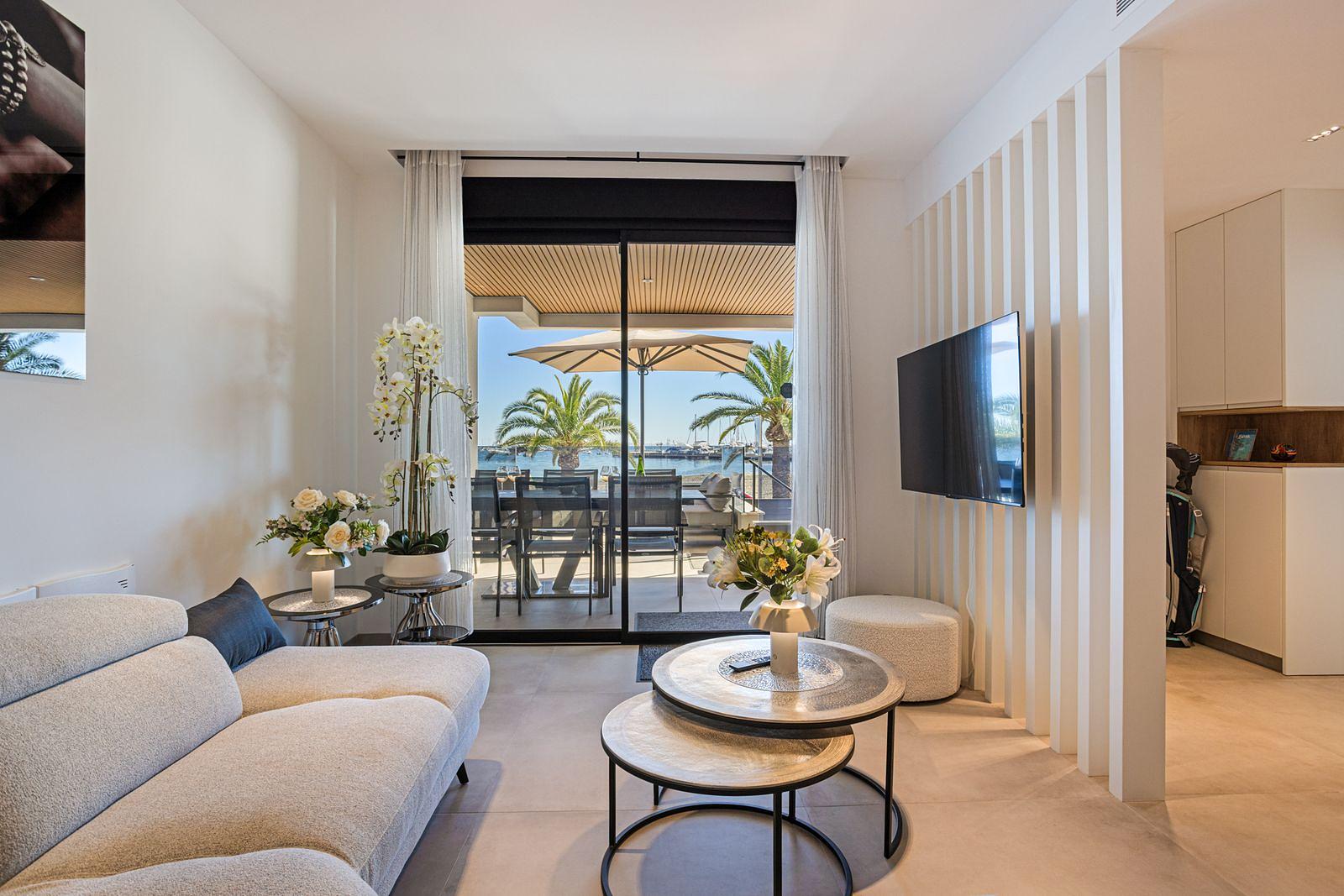 Featuring a bright open-plan living area designed for comfort and relaxation, welcoming space to unwind after a day at the beach, while large windows bring in natural light and beautiful sea views.