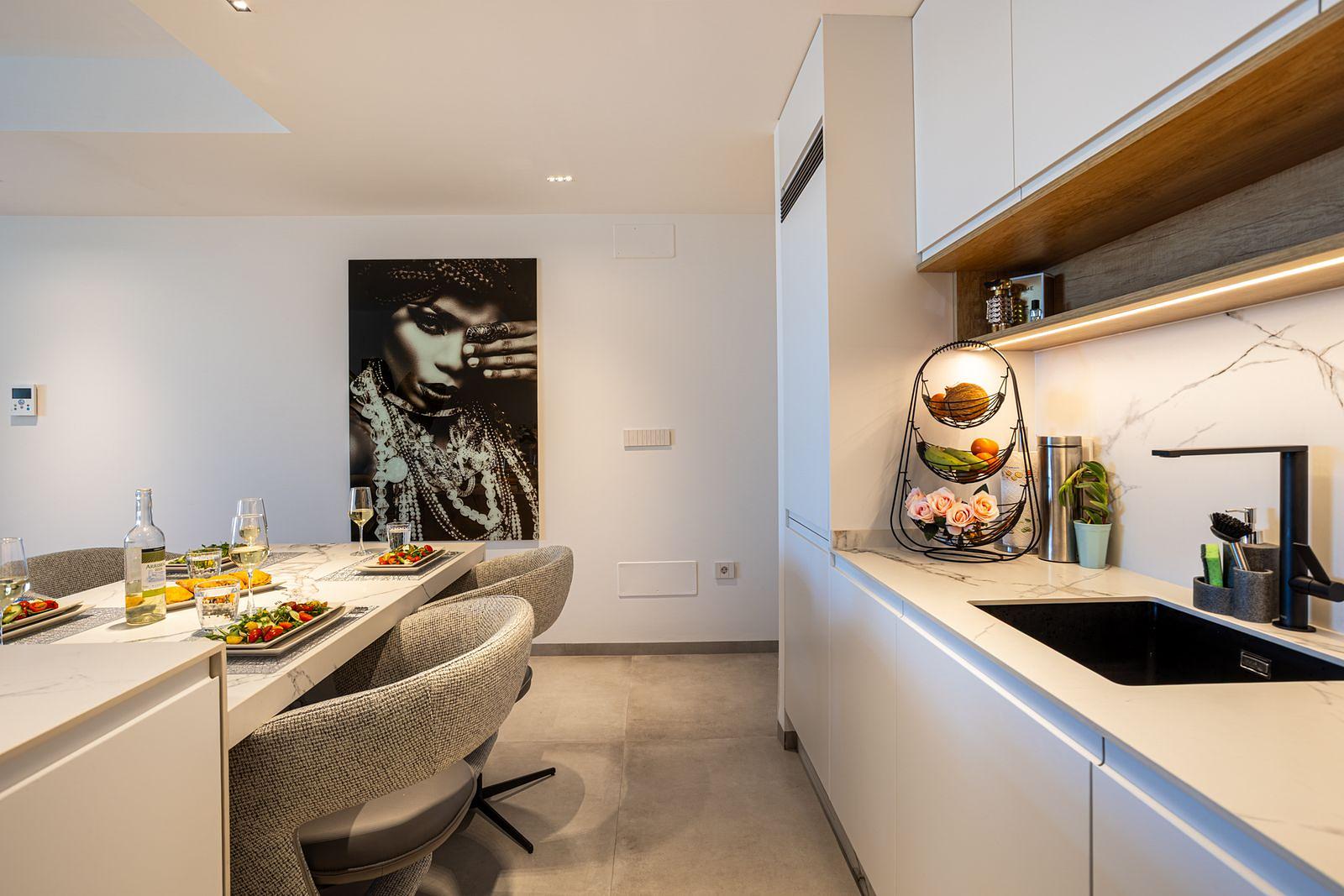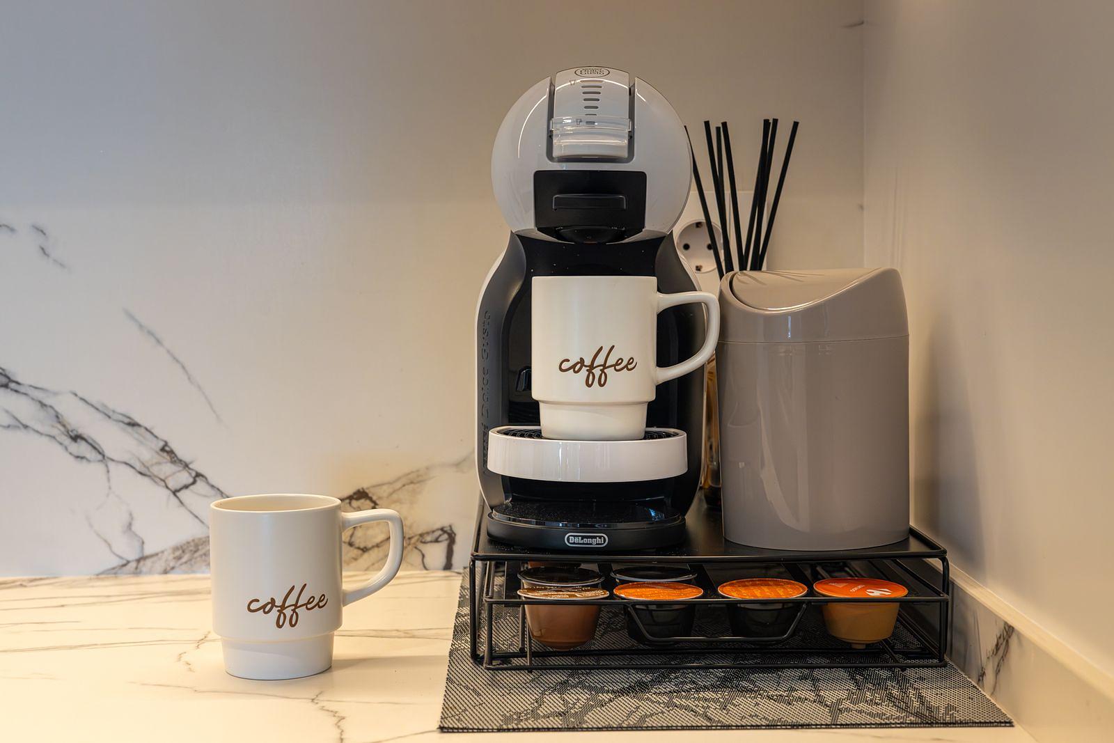 The fully equipped kitchen includes everything needed for a comfortable stay, including modern appliances, a Dolce Gusto capsule coffee machine, toaster, blender and all kitchen essentials.